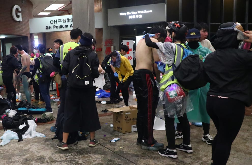 在香港理工大學的另一頭,醫護人員正在幫被警方藍色刺激性液體噴到的示威者療傷。
