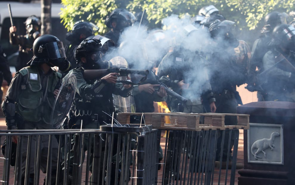 香港警方朝準備離開理大校園的示威者發射催淚瓦斯。