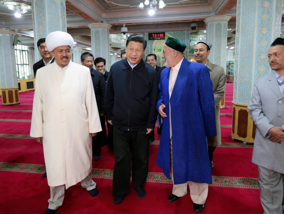圖為 2014年4月,習近平前往新疆視察的畫面,畫面中的他來到了烏魯木齊市的清真寺參訪。