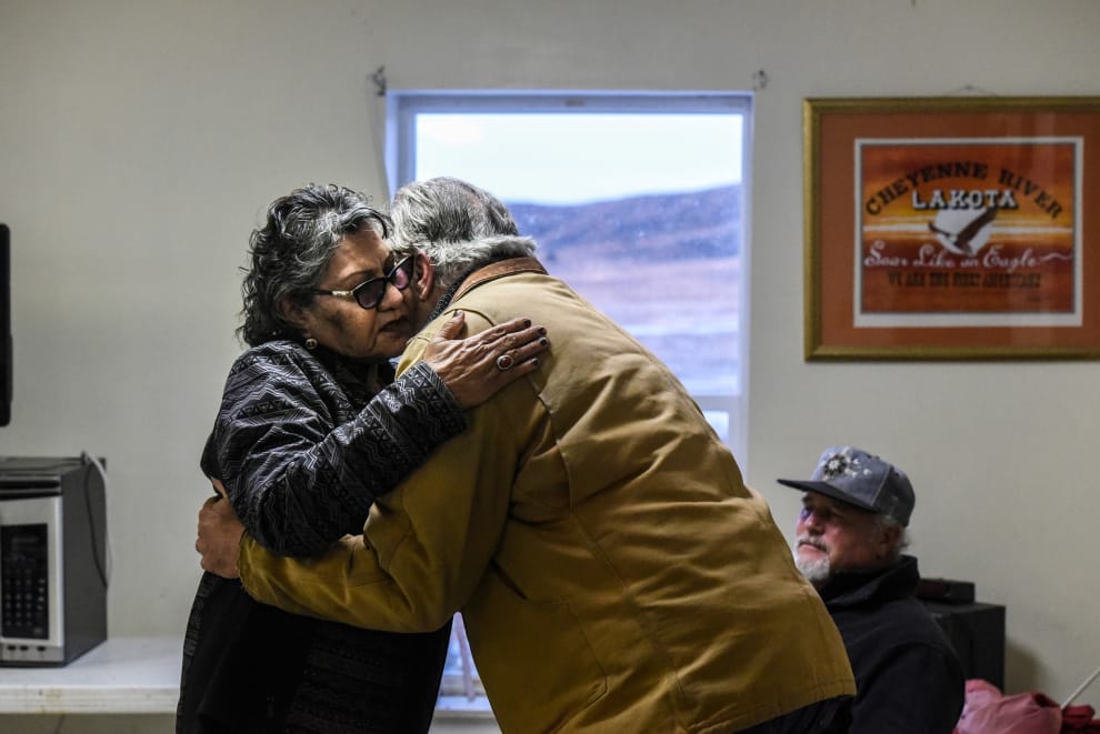 在夏安河蘇族保留區(Cheyenne River reservation),瓦洛其(左,Dena Waloki)與厄普頓擁抱著彼此。