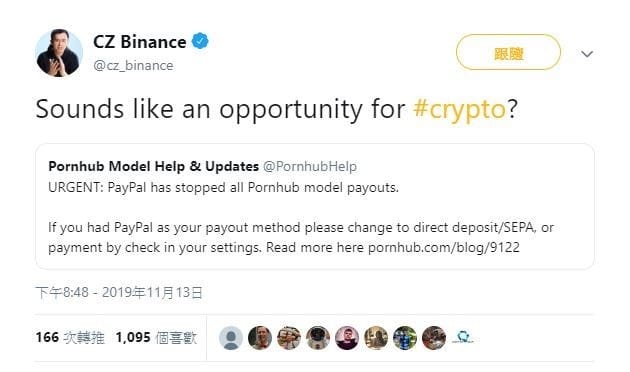 幣安執行長趙長鵬在推特上表示,PayPal中止為Pornhub服務,或許是密碼貨幣的機會。