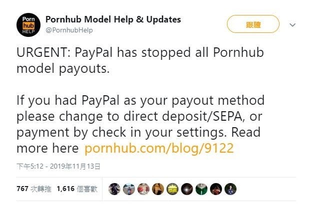 Pornhub在推特上緊急通告PayPal中止服務的消息,並呼籲成人明星們盡速更改收款方式。
