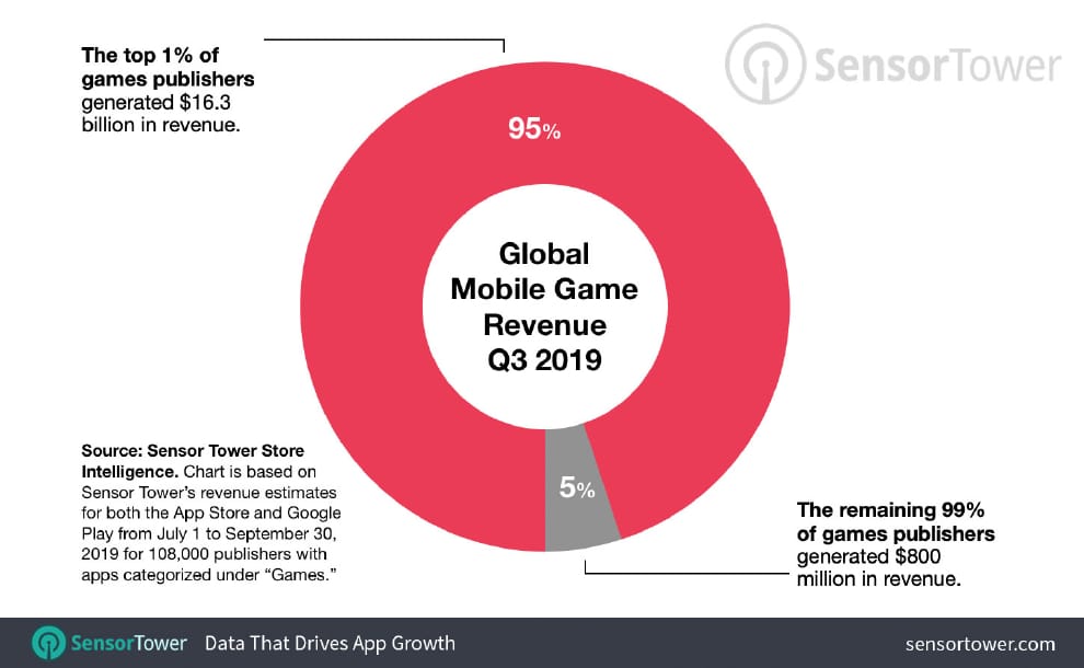 合作夥伴遊戲 App 更有 95% 的收入歸於前 1% 的開發商。(Source:Sensor Tower)
