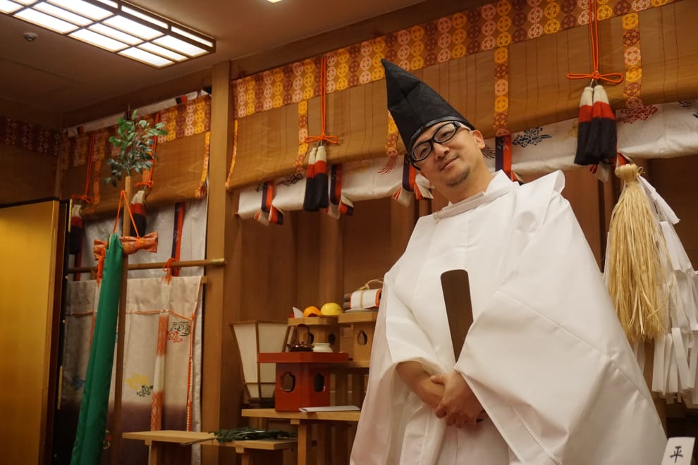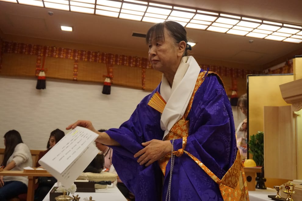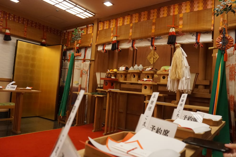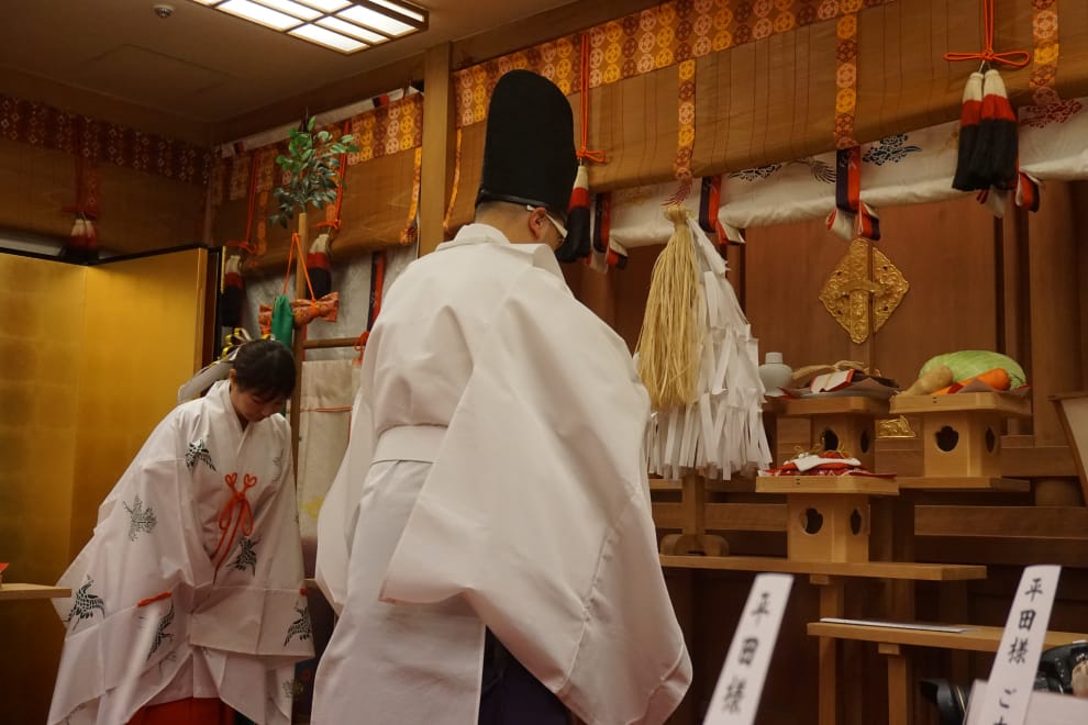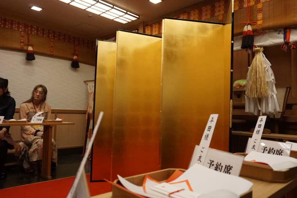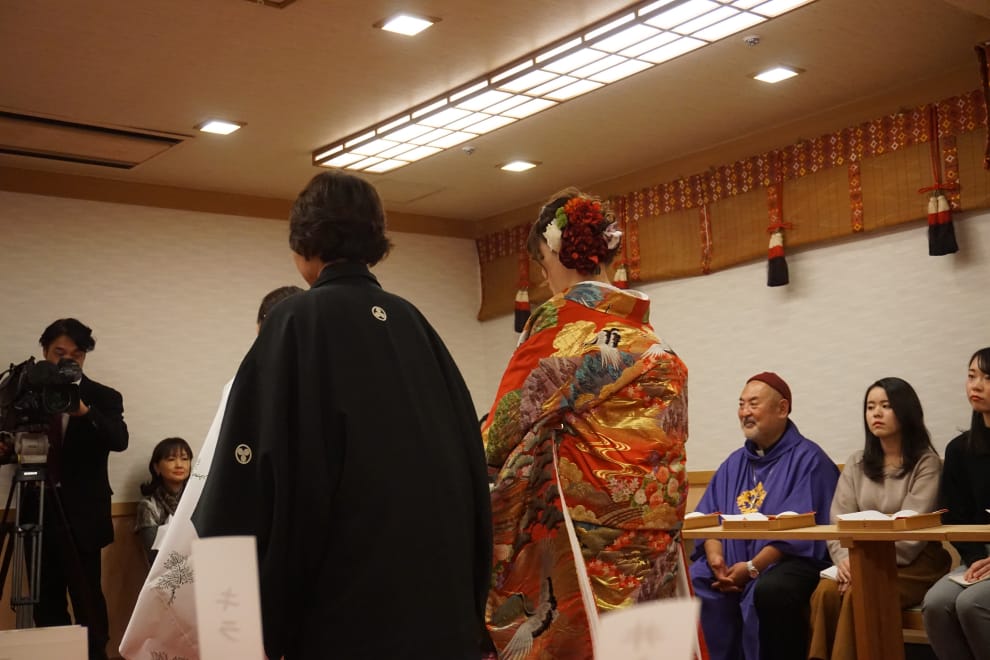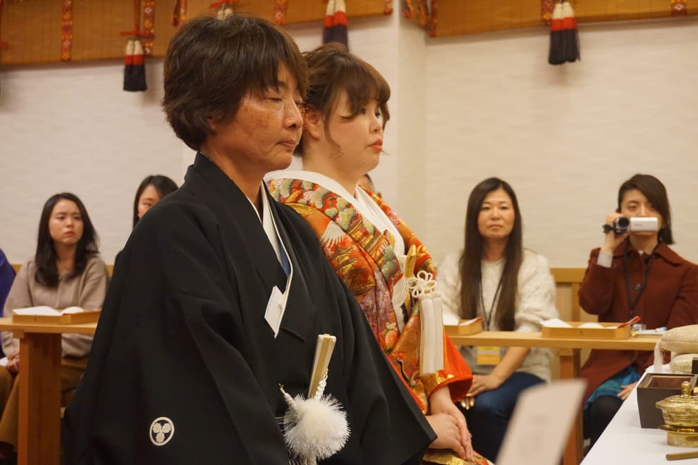 結束了上半場的西式婚禮,下半場是在和式神壇前舉行神道教的「神前式」與佛教的「佛前式」。神前式是由開運・幸福祈願神社「願いの宮」的桃山きよ志(井上清志)宮司主持。