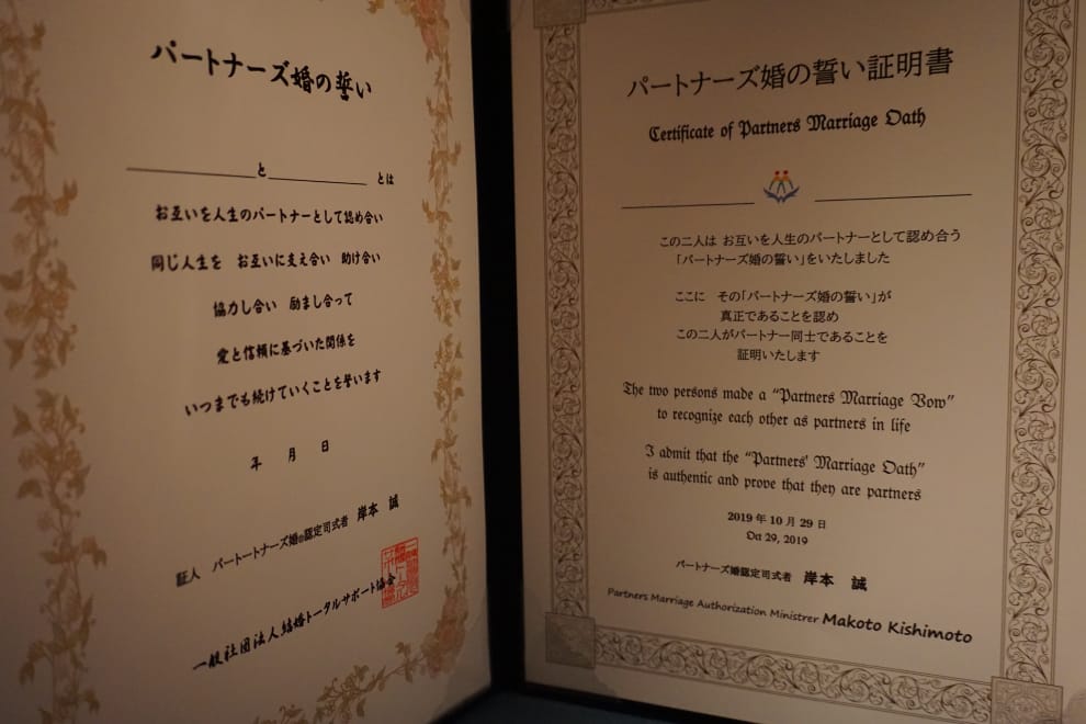 全力支持結婚協會每個月會定期舉辦跨業種的交流會,目前已經有婚紗業者、旅館業者、行政書士、保險業者加入,讓大家一起思考有哪些事情是縱使法律上同性伴侶還不能結婚,但民間業者可以先做的。其中一個例子就是,全力支持結婚協會獨自發行民間版「伴侶婚證明書」(パートナーズ婚証明書):不管是LGBTQ+還是異性戀伴侶,只要是任何想要和另一半組成「伴侶」的人,都可以向全力支持結婚協會申請「伴侶婚證明書」。