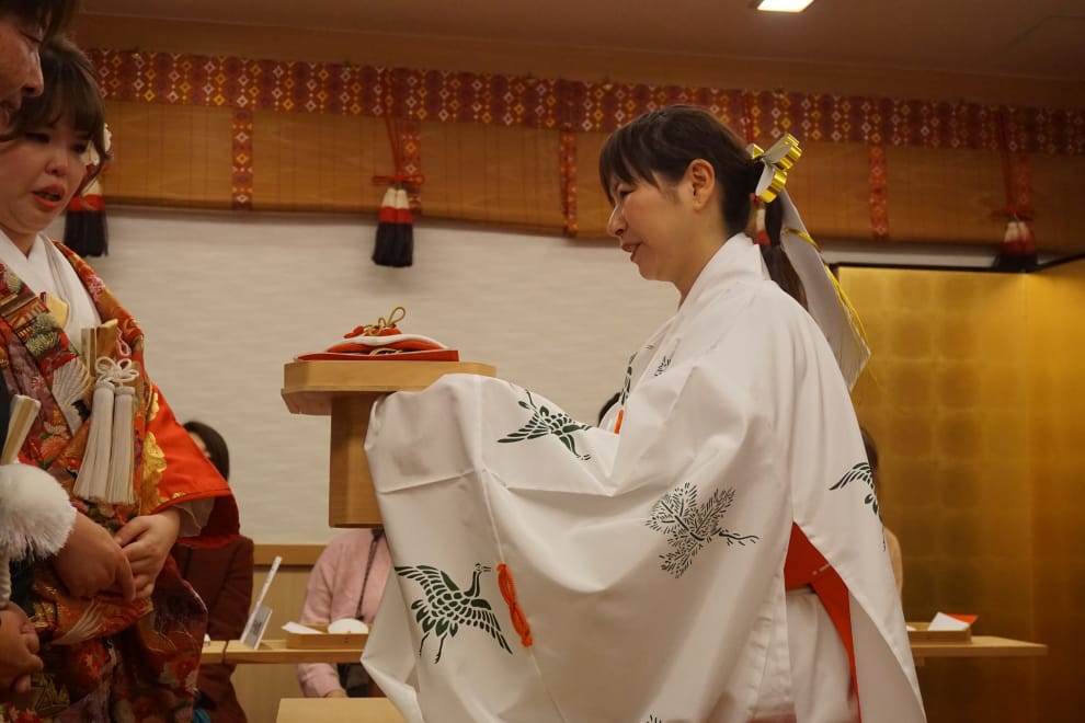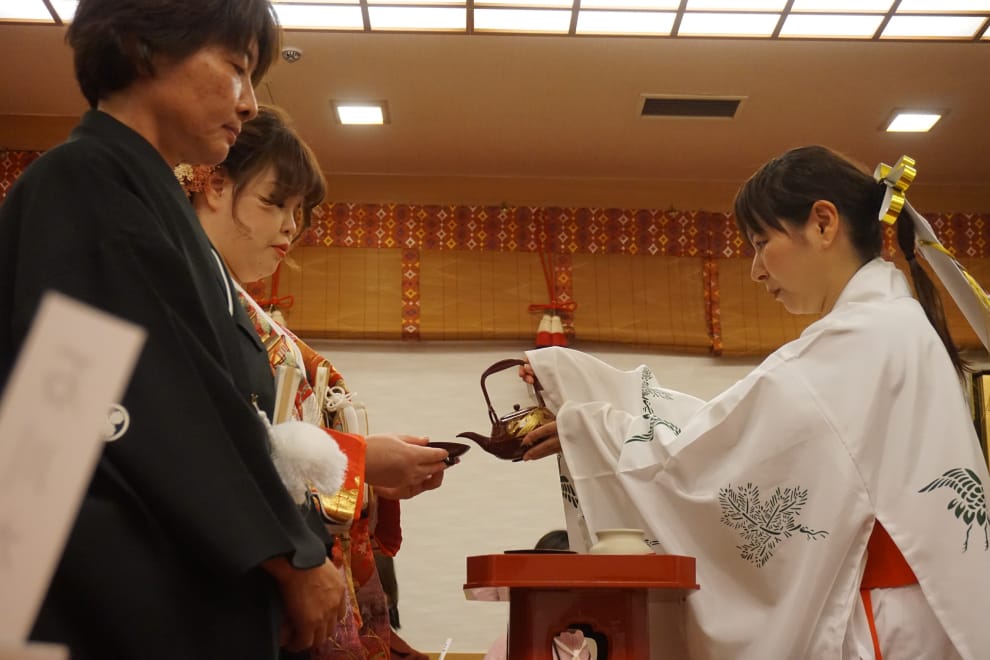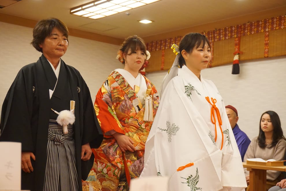 8. 「彩虹伴侶結婚特展」當天省略了「巫女の舞」,及雙方親友聽從齋主指示一起喝下巫女斟的酒(一樣要分 3口喝)的「親族盃の儀(しんぞくはいのぎ)」