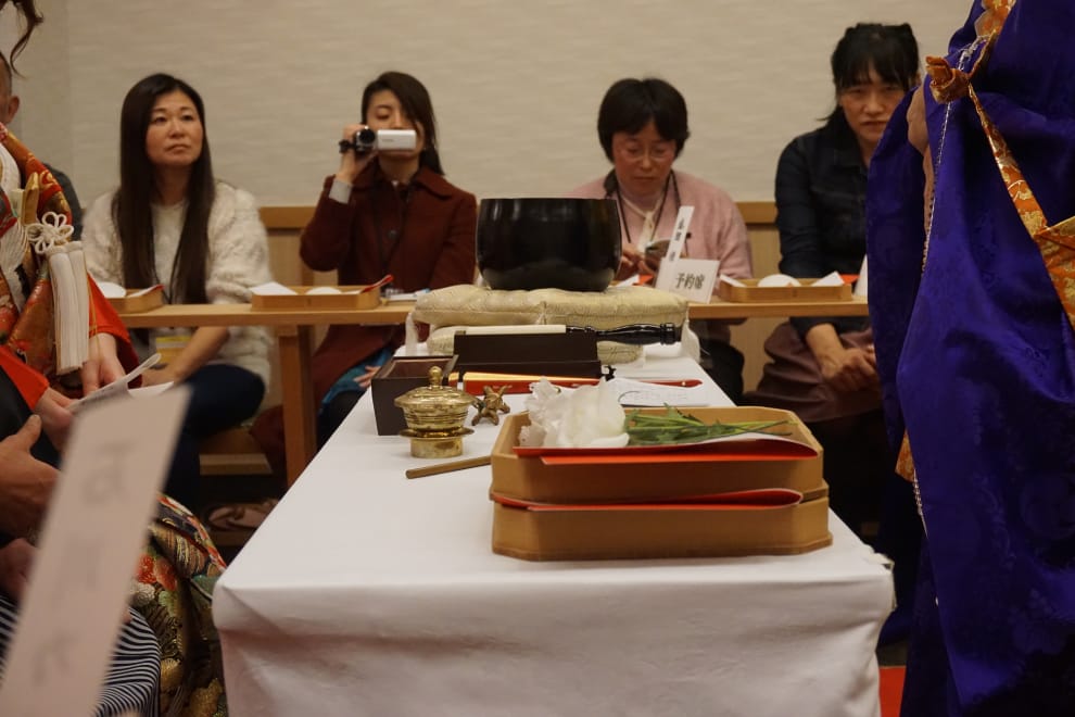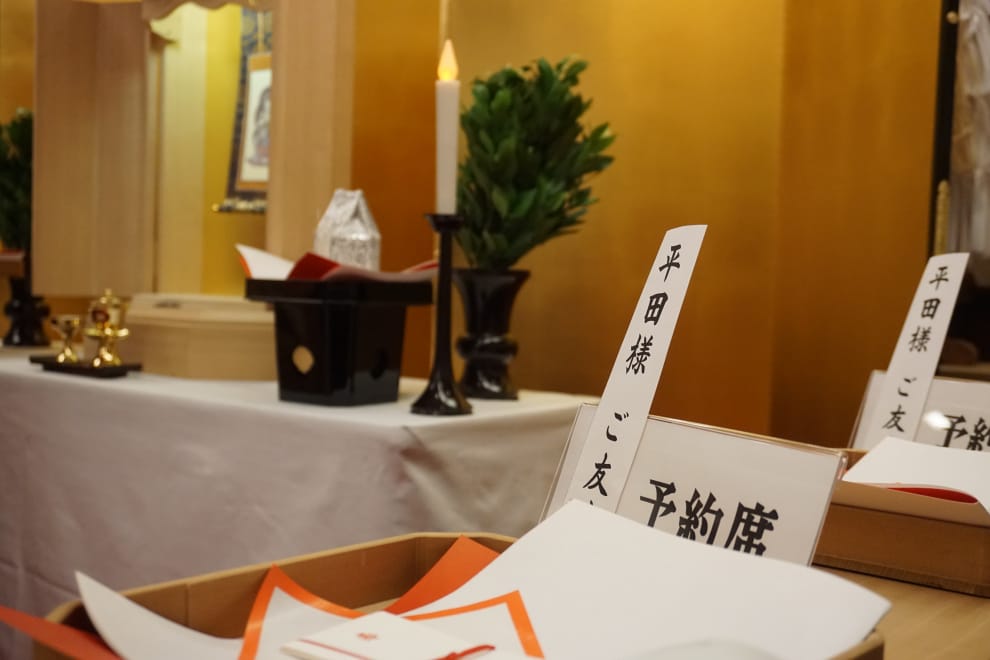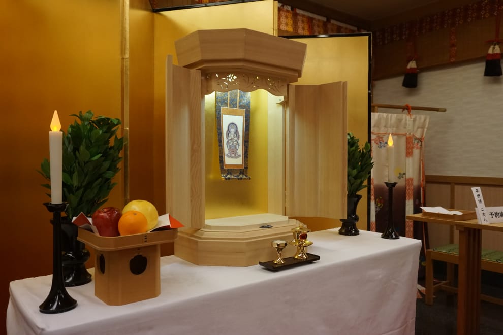 從「神前式」變成「佛前式」,飯店人員直接拿了一塊金色屏風把神道教的神壇擋住,原本在神壇旁的帶有神道教色彩的擺飾沒有辦法被金色屏風擋住,就索性搬到會場外。擺好金色屏風後,接著拿了一張鋪有白布的神桌,在神桌上擺上佛壇、酒杯、鮮果、花,還有蠟燭燈,並接上電源替佛壇「點燈」。與此同時,我正前方的桌面也換上真言宗的擺設與法器。
