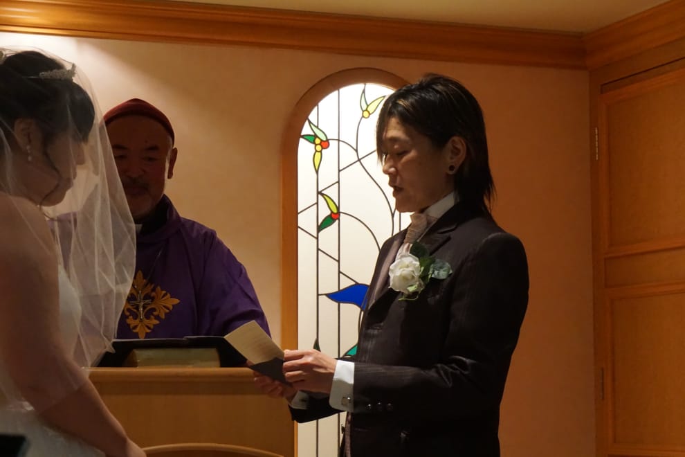 負責證婚的山口光說,看到A和B交換誓約的時候兩個人都哭了,自己也忍不住落淚,但身為神職人員其實不應該這樣,所以他很努力要忍住眼角的淚水。岸本誠接著說,基督宗教式的婚禮因為雙方當事人就站在牧師前面立約,牧師這個角色是最能直接感受到新人情緒的人,有的時候真的會被現場氛圍感動流淚,特別是同志婚禮最感人。岸本誠還不忘強調,異性戀的婚禮沒有同志婚禮感人,「我是說真的,異性戀的婚禮才沒有這麼感人」。
