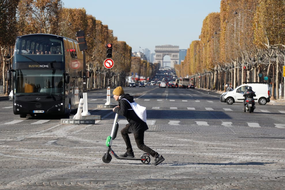 一名男子正騎著Lime電動滑板車通過香榭麗舍大道,這種便利的移動方式將巴黎的共享運輸捲入全新戰局。