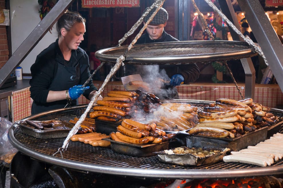德式香腸是歐洲聖誕市集的經典款,如果你人在德國,市集中賣的香腸種類更是多到令你數不清。在冷冷的天氣看著店家的鐵盤煎出一根根香腸,再搭配上酸菜和鬆軟的麵包一起下肚,這樣一份香腸堡絕對能帶給你滿滿的幸福感。