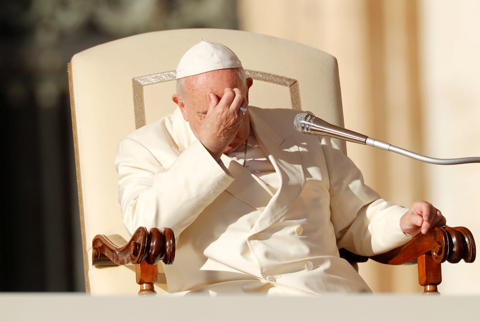 今年 12月4日,羅馬天主教宗方濟各在梵蒂岡聖彼得廣場參加每周彌撒儀式時,用手扶著額頭稍作休息。