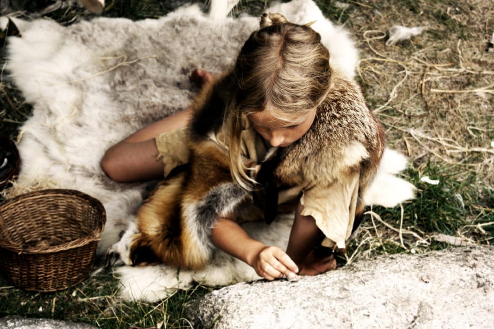 圖為當代一名模仿石器時代打扮的小女孩。