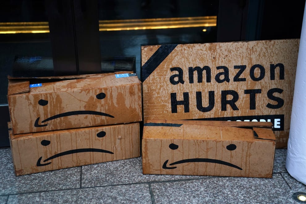 今年 12月2日,民眾在紐約街頭抗議亞馬遜對員工照顧不周、把員工當作機器人般看待,他們把亞馬遜的招牌微笑標誌改成了嘴角向下的癟嘴臉。