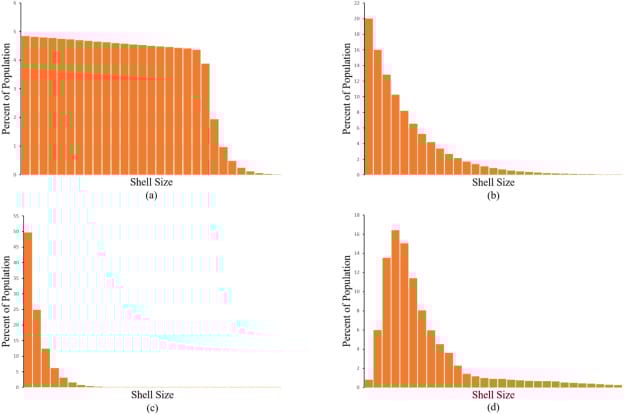 研究團隊原本以為,寄居蟹殼的大小分布曲線應該會受寄居蟹蟹體大小(假設牠們都能找到符合自己體型的殼)和留下殼的生物(如蝸牛、螺類等)死時的大小而變化。如果真是如此,寄居蟹殼的大小分布曲線應該要和生態學中的三種存活曲線之一相近才對。