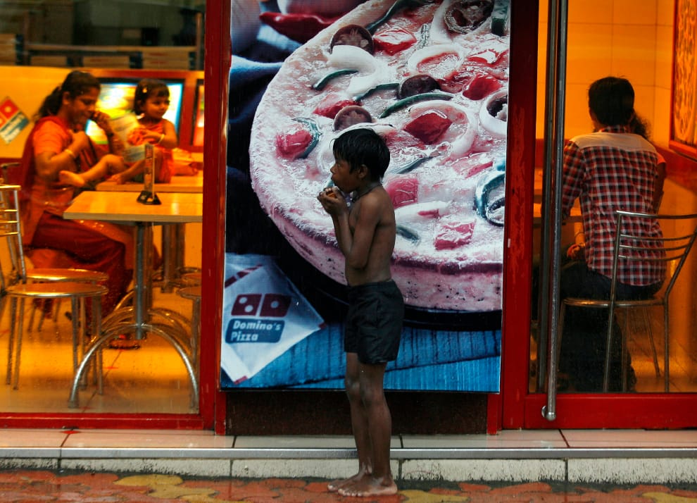 寄居蟹社會和人類也有類似於財富分配不均的問題。圖為一名在餐廳屋簷下躲雨的印度男孩。