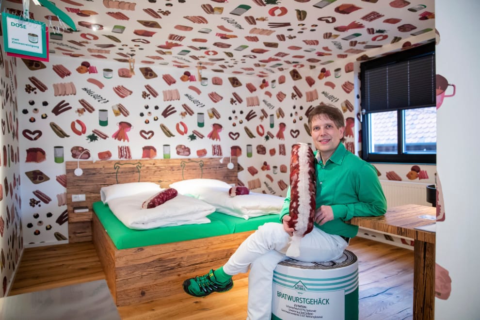 在德國南部城市Ritterstraße,有一間充滿各種香腸造型物品的旅館,一走近這家旅館的房間裡,香腸壁紙肯定會率先衝擊你的視覺神經;覺得累了嗎?不妨躺在香腸造型的枕頭上休息休息;這時不妨抬頭看一下:瞧,一根被吊在天花板的香腸正在和你打招呼呢!