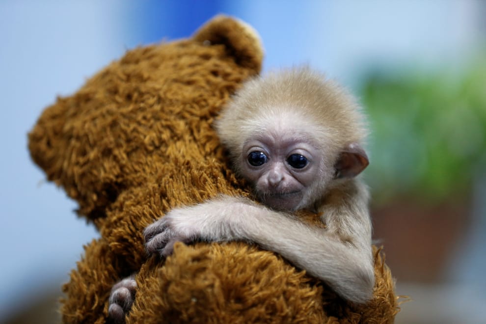 兩個月大的長臂猿「吉姆」(Jim)緊緊抱住比牠大得多的泰迪熊。面對動物園迎來冬季封館,現在的牠可要好好休息了。