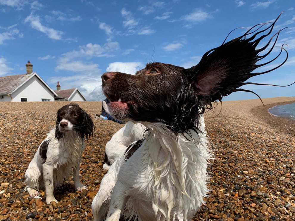 在位於倫敦西南岸的海灘上,狗狗們興奮地和主人玩拋接,飛揚的毛髮意外創造出洗髮精廣告一般的效果。