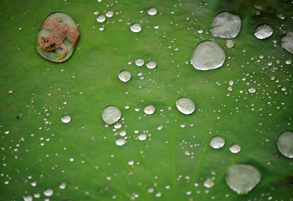 一隻青蛙恰好被完整地包裹在露珠裡,一切彷彿停格在這一刻。
