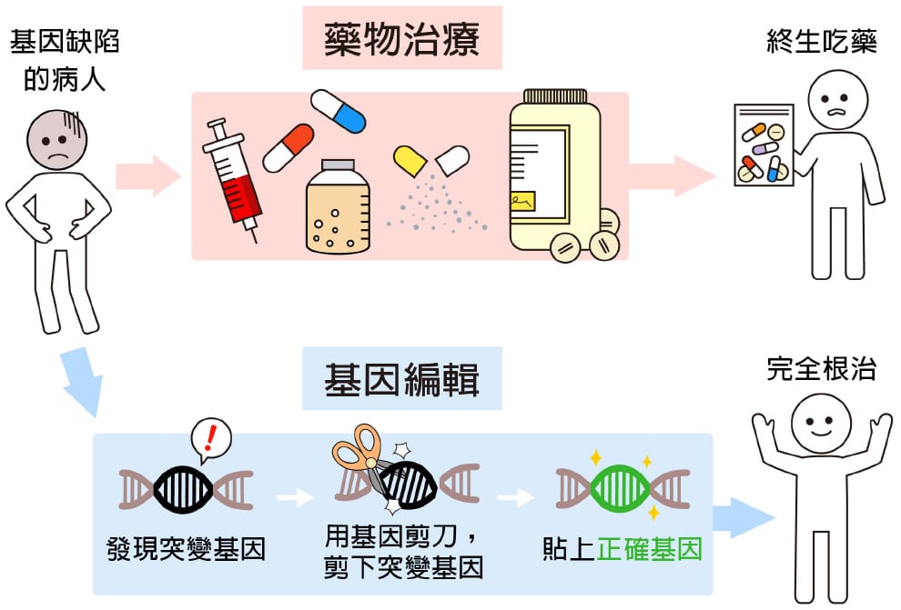 過去基因突變引發的疾病,藥物無法根治,必須終身吃藥。現代的基因編輯技術,可以徹底根治基因缺陷,就像用文書軟體修改錯誤一樣:找到錯字 (發現突變基因)、刪除錯字 (剪下突變基因)、補上正確的字 (貼上正確基因)。