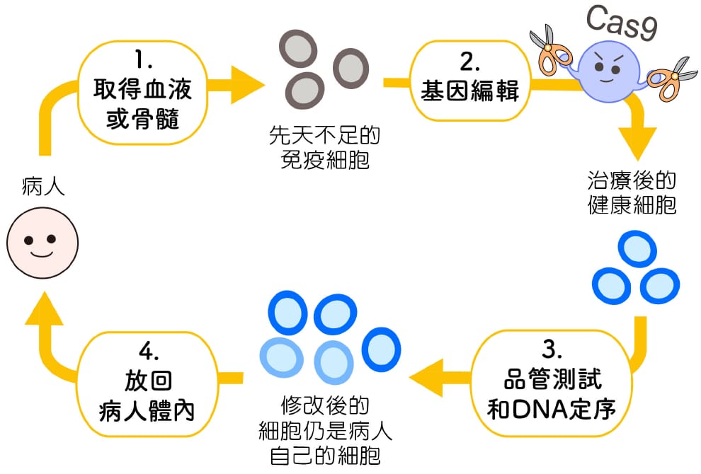 目前基因編輯還不適合直接編輯人體內的細胞,比較安全的做法是把細胞拿出,在體外編輯,例如:修正免疫細胞的基因,治療免疫疾病。