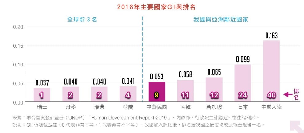 性平處表示,台灣不只性別平等程度居亞洲之冠,女性參政權力持續增長,2018年女性立法委員比率創新高,占38.7%,鄰近中國、日本、南韓及新加坡均未達三分之一。另外,縣市長女性比率則升至37.5%,相較於2014年選舉相比,顯著提升31.2個百分點,而且是1997年以來,首次超過三分之一性別比例。
