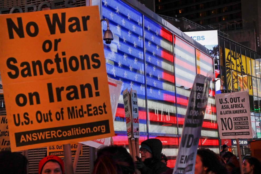 8號這天,美國紐約時代廣場出現了抗議民眾,他們呼籲美國不要再對伊朗施以制裁或開戰,並且要求美國離開中東。