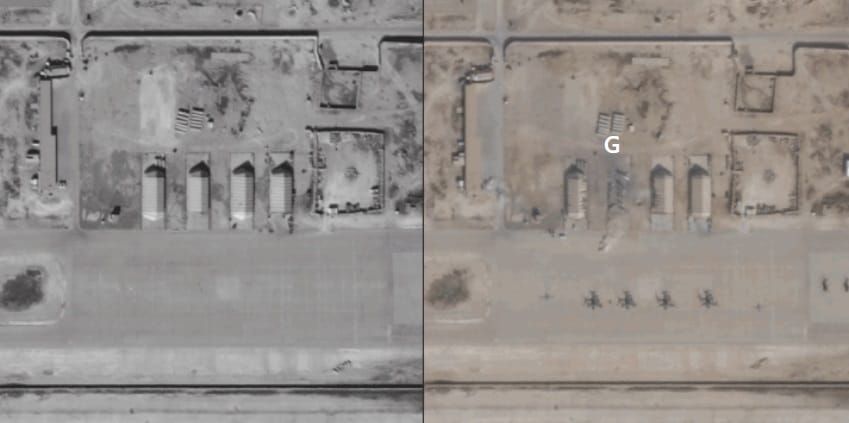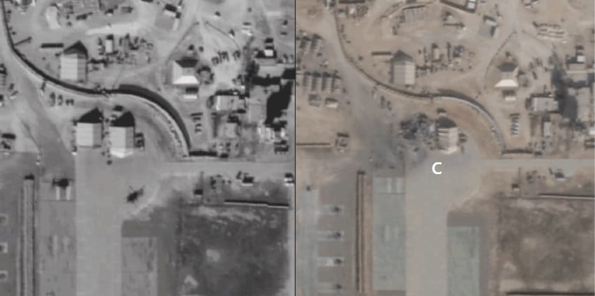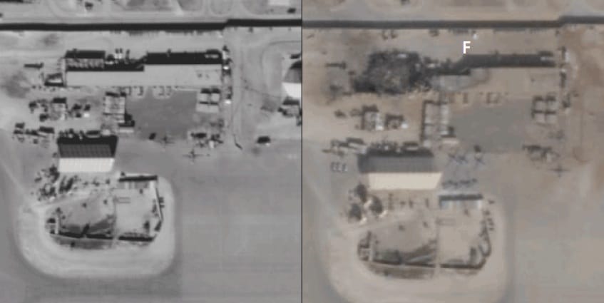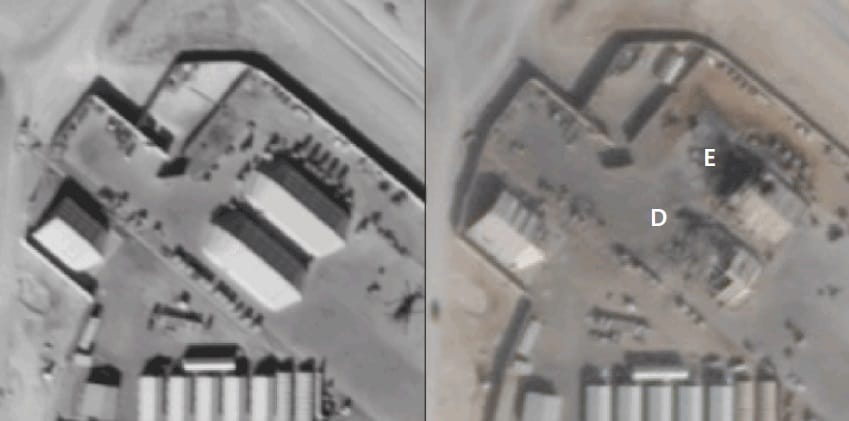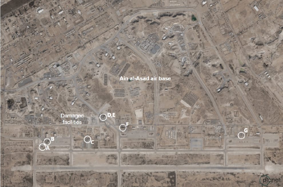 在這張衛星照片中,可以看到伊拉克阿薩德基地遭到伊朗飛彈攻擊過後,有六個點受到了損害。