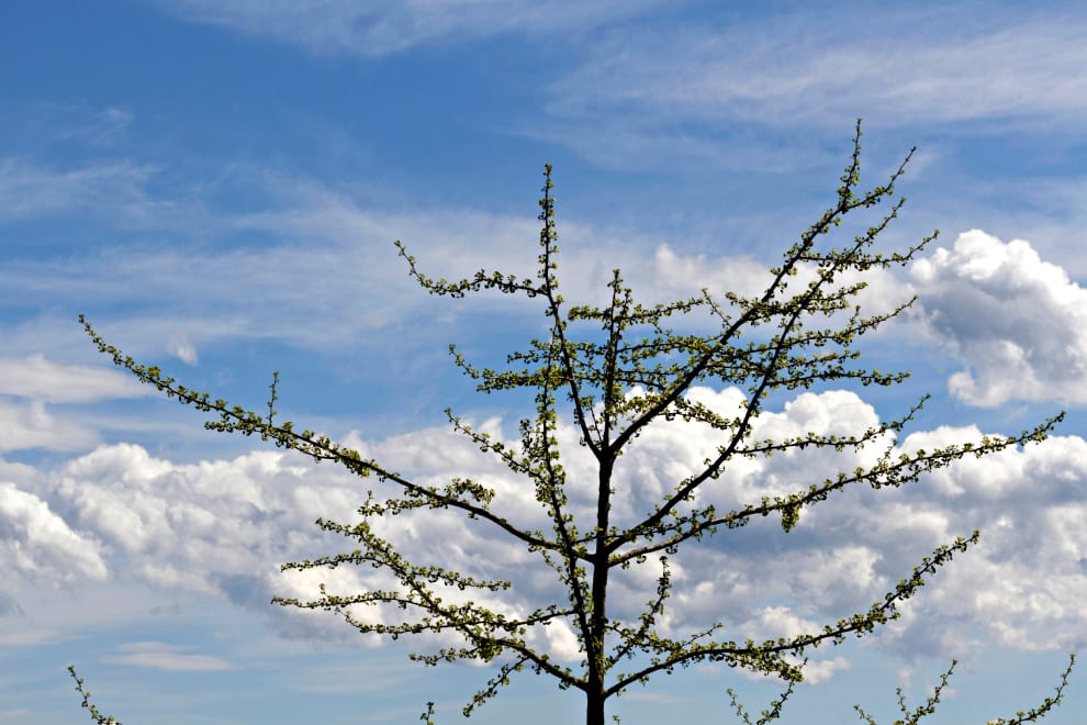 因為人類伐木的關係,野生銀杏已經瀕臨滅絕,銀杏在國際自然保護聯盟(IUCN)瀕危物種紅色名錄上也被列為「瀕危物種」。圖為銀杏樹初春時節的模樣。