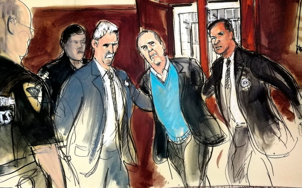 圖為 2018年5月,韋恩斯坦(身穿藍色毛衣者)在紐約刑事法庭上的素描畫。