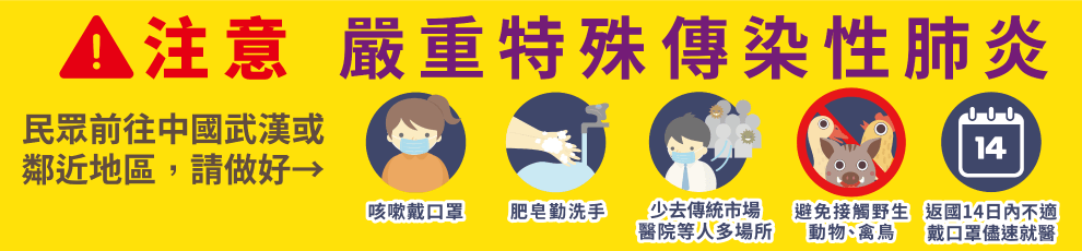 我國疾管署則提醒民眾,若最近有要前往中國武漢及鄰近區域,應落實肥皂勤洗手、咳嗽配戴口罩等個人衛生措施,避免接觸野生動物及急性呼吸道感染症患者,也避免出入傳統市場及醫療院所。