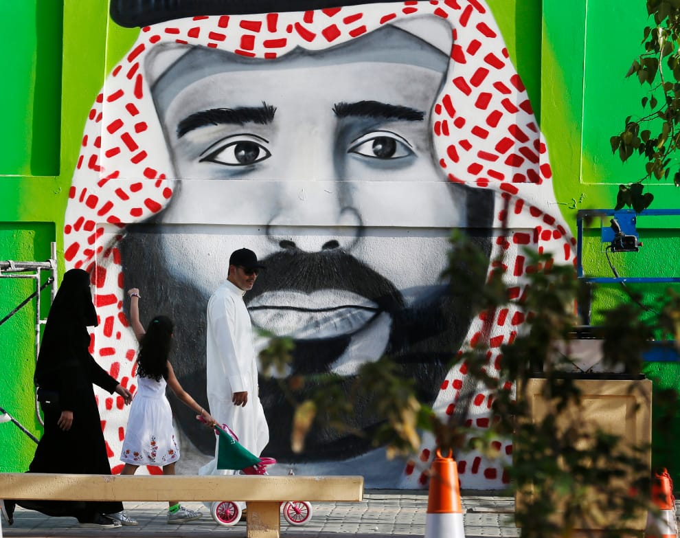 在沙國首都利雅德,人們走過沙國王儲沙爾曼王子的塗鴉壁畫。