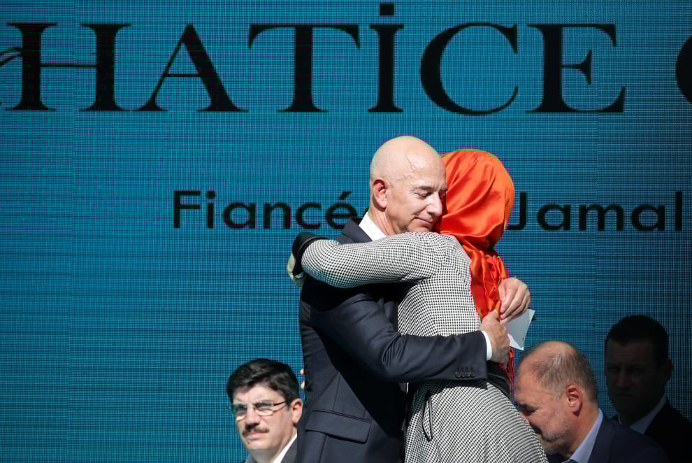 2019年10月2日,在悼念《華盛頓郵報》專欄作家哈紹吉遭謀殺滿周年的活動上,《華盛頓郵報》老闆貝佐斯給了哈紹吉的未婚妻堅吉茲(Hatice Cengiz)一個擁抱。