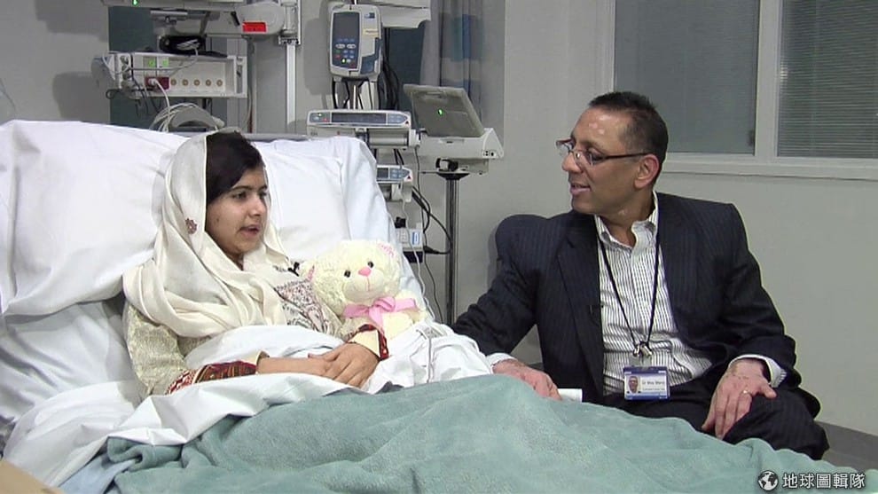 照片中病床上的就是馬拉拉,她奇蹟似地逃過致命槍殺,漸漸康復的她正與主治重傷的醫生談天。