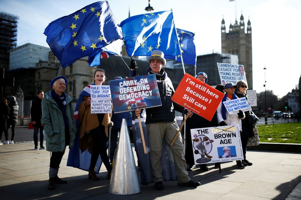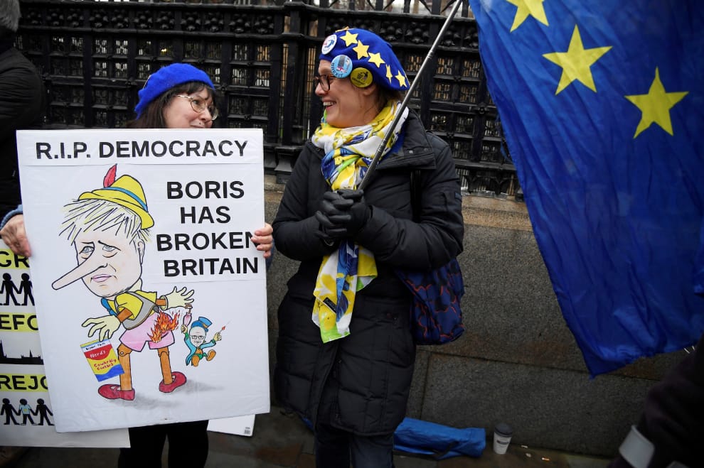 30號這天,在倫敦國會大廈外,反脫歐民眾手拿歐盟旗幟,還有一面把英國首相強生畫成說謊小木偶的海報抗議。