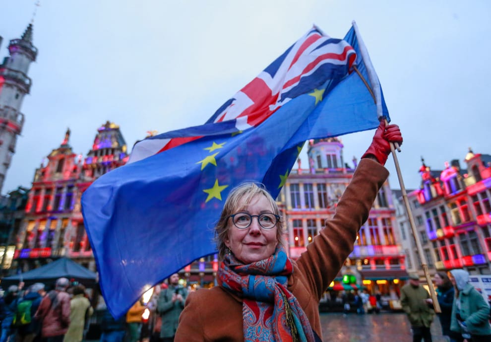 在布魯塞爾大廣場上,一名女子手拿歐盟和英國旗幟,她周遭的建築物被打上了象徵英國國旗的紅色、白色和藍色,藉此歡送英國脫歐。