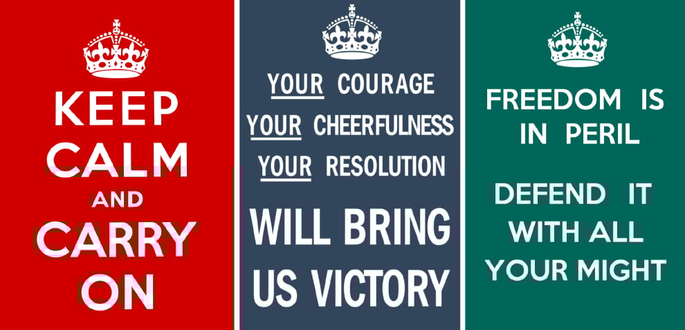 這些都是 1939年,英國政府在第二次世界大戰開始之前所設計的海報,當局希望能在戰事爆發張貼這些海報以鼓舞民眾。在設計上,海報除了擺上英國國王喬治六世的王冠,還採用兩色的鮮明對比,並使用特殊設計的無襯線字型,讓人們能在遠處就一眼認出這張海報。