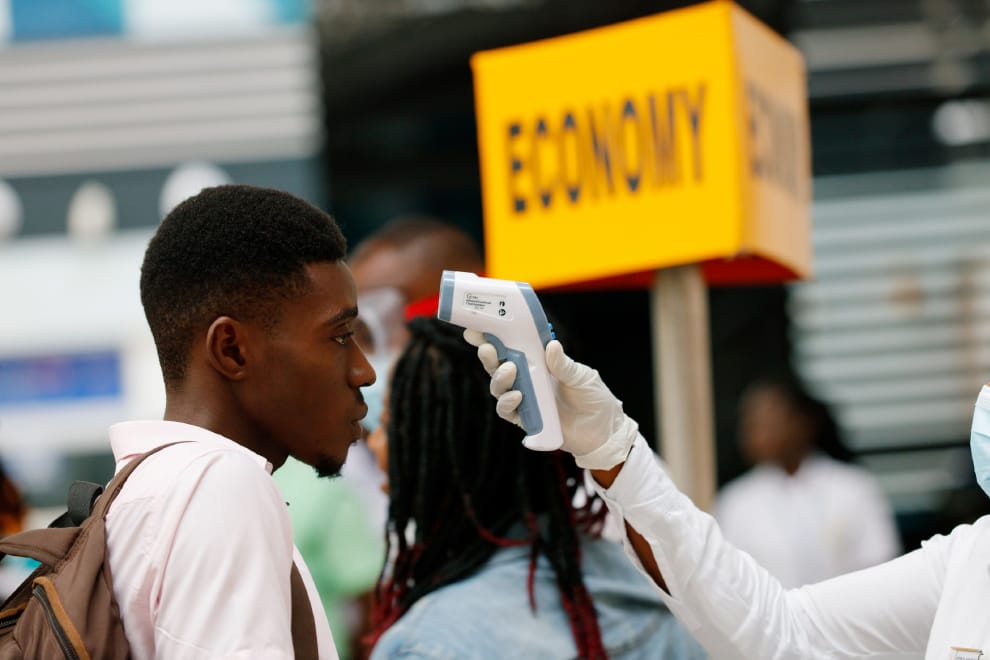 30號在加納的科托卡國際機場裡,一名旅客正在接受體溫檢測。