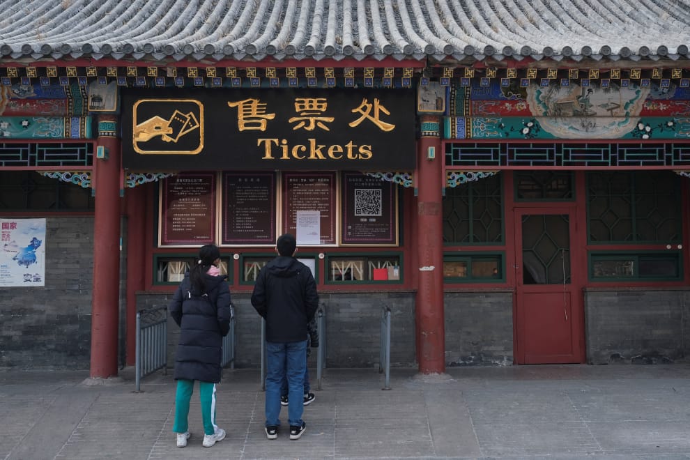 27號在北京居庸關長城風景區,遊客們在售票處看著為了防範武漢肺炎感染而關閉的告示。