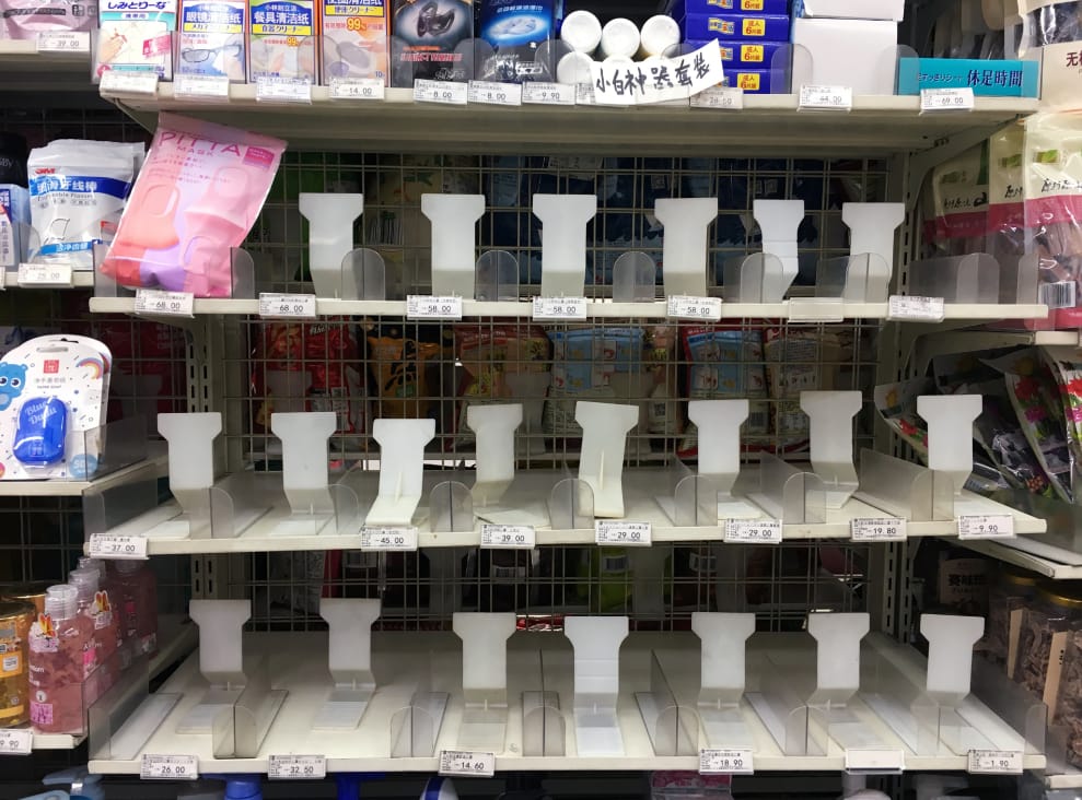 21號在北京一間商店內,原本放著口罩的貨架上空空如也。隨著引發「武漢肺炎」的新型冠狀病毒肆虐,人們將口罩搶購一通。