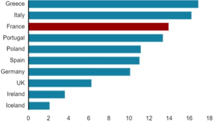 這還不打緊,重點是退休之後的所得替代率(編註)法國是73.6%,遠高於OECD國家成員的平均值58.6%,被認為是先進國家當中最優沃的退休制度。由此衍生出來的問題是,退休金成本愈來愈重,根據OECD的統計,退休金支出占GDP比重,法國為14%,在全球幾乎名列前茅,只有希臘與義大利高於法國的占比。