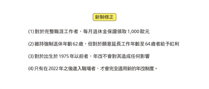 為了平息眾怒,馬克宏宣布自己卸任之後,將放棄總統特有的退休金每月6,000歐元,加計放棄擔任憲法委員會一員的津貼每月1萬3,500歐元,合計每月約1萬9,500歐元。同時,法國政府也部份修正內容,如下圖: