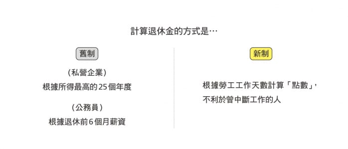法國舊制規定退休金的計算基礎,在民間是根據其所得最高的25個年度來計算,在政府部門則是根據其退休前的6個月薪資來決定,因此就算勞工在整個職涯當中有過短暫失業或轉換工作跑道,對他們的退休金都不會有很大的影響。