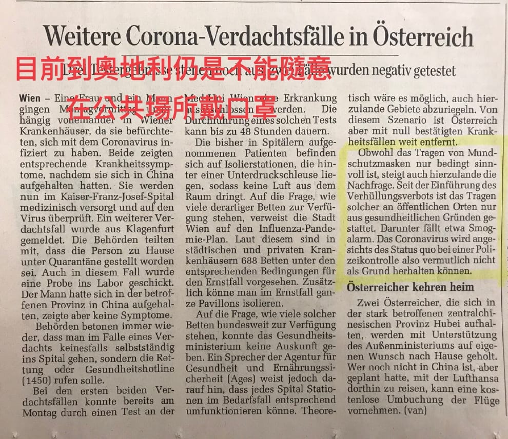 今年 1月28日,台灣駐奧地利代表處在貼文中談及奧地利官方目前對戴口罩的看法。