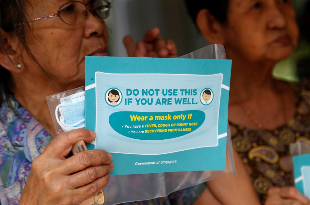 本月 1號,新加坡針對一個家庭免費發放 4個口罩,口罩上的文宣強調如果身體健康的人不用配戴,有發燒、咳嗽、流鼻水,或是正在從感冒中痊癒的人才需要配戴。