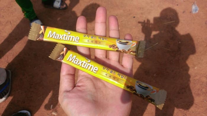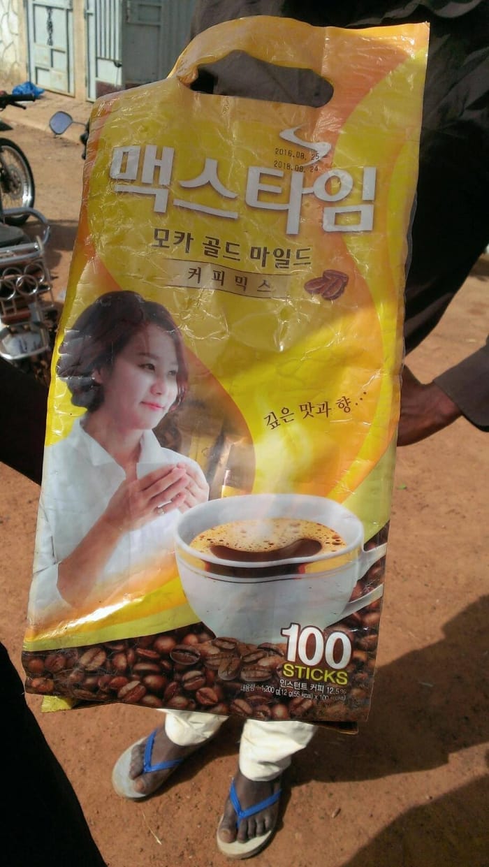 某次我有幸跟治療師本人交談,他馬上操起本業關心我的身體狀況,那時的我向他表示因為工作壓力大而經常性頭痛。他隨即一臉得字的幫我「診療」,並表示他有剛從國外進口、效果奇佳但口感稍苦的特效藥,只要搭配熱水沖服食用,頭痛就能馬上痊癒。我半信半疑地瞧了瞧,只見他的助手拿了兩包即溶咖啡給我,我不禁愣住,想說這是在開玩笑嗎?沒想到治療師立馬秀出印有韓文的原包裝: