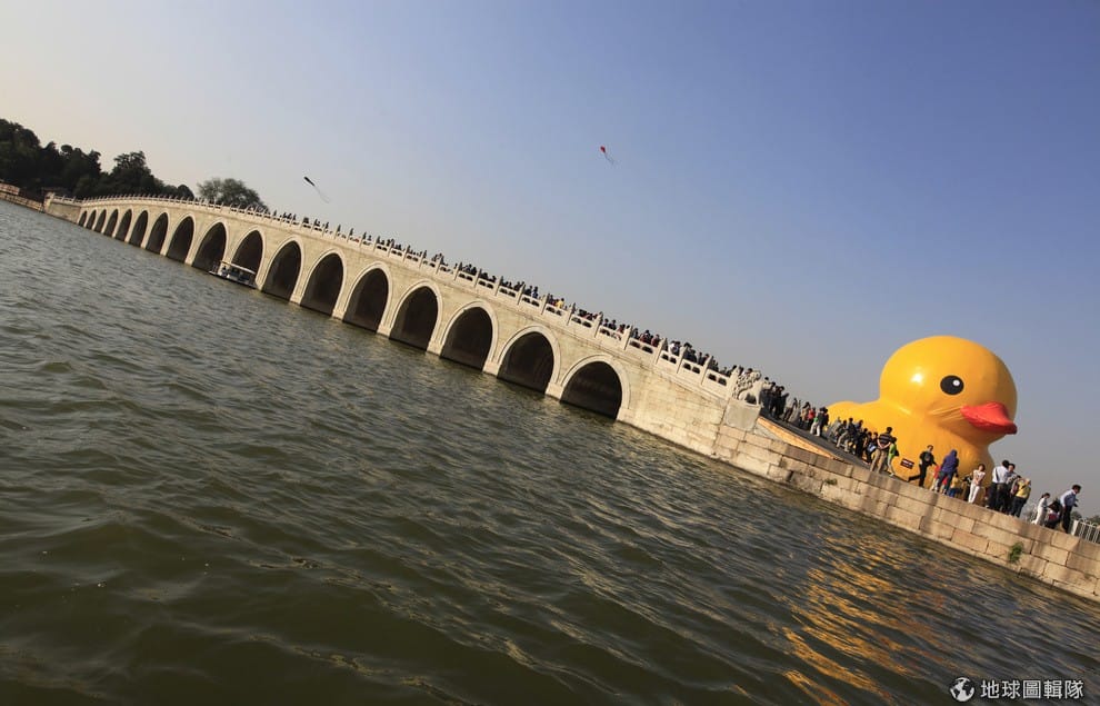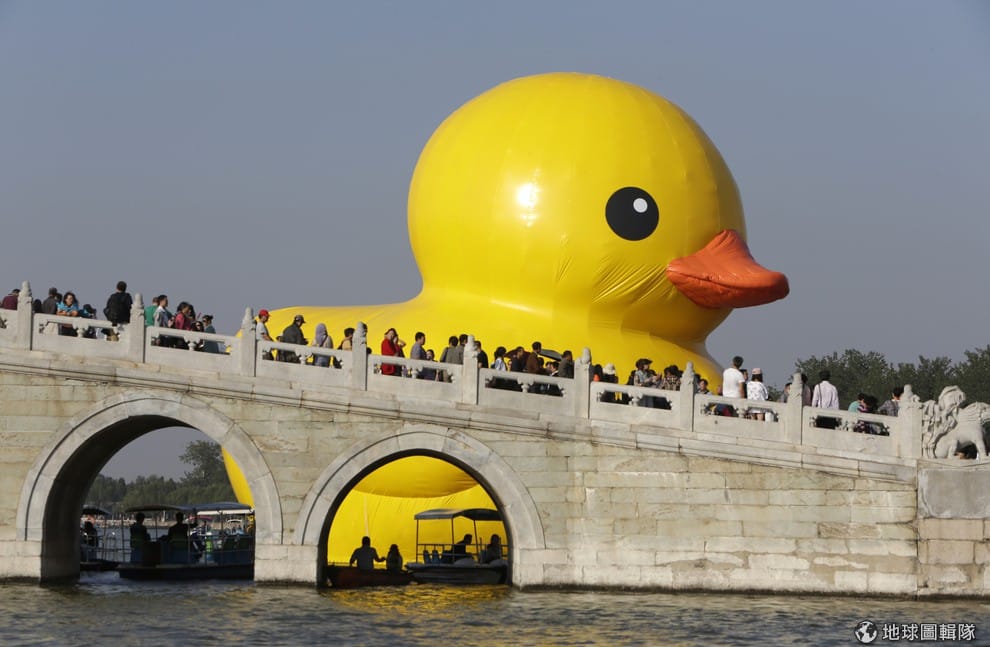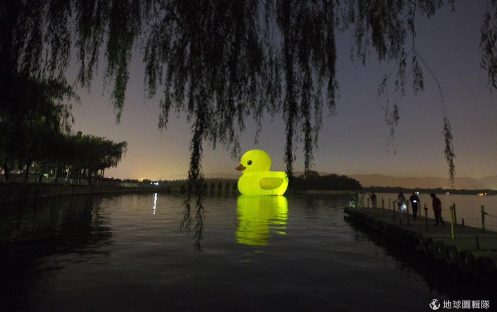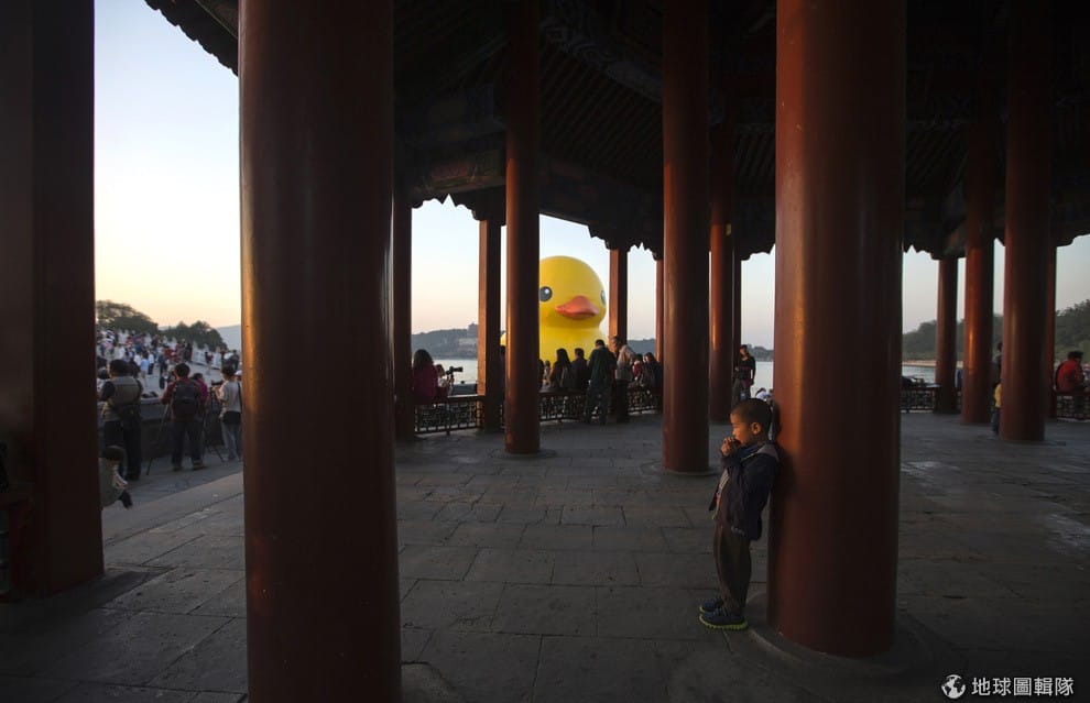 路透社小黃鴨的風采壓過了圓明園美景,大家全都圍在一旁抬頭看