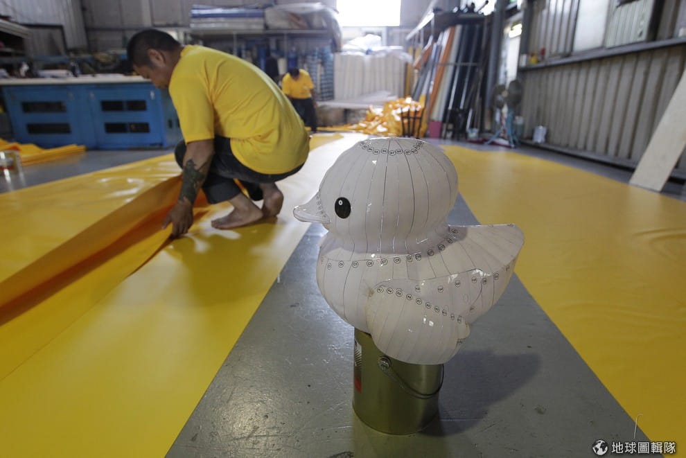 路透社裁剪完成的防水布再拿到縫紉區趕工「組裝」,完成的小黃鴨重達1000公斤、高18公尺