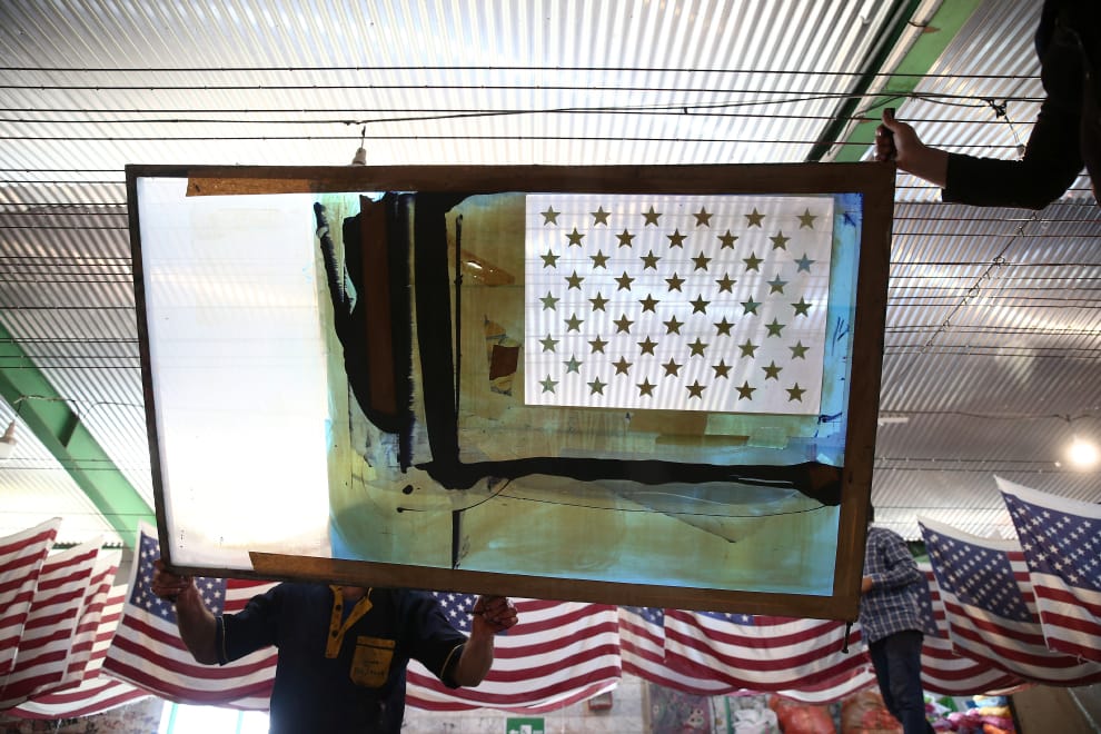 在伊朗國旗工廠內,工作人員正在調整美國國旗的模具。