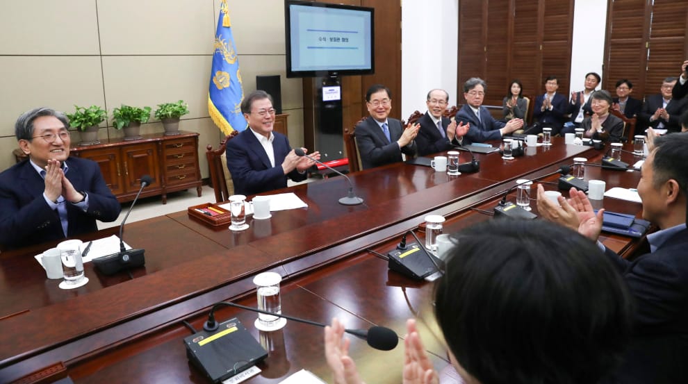美聯社 / 達志影像在得知《寄生上流》抱回奧斯卡四項大獎後,南韓總統文在寅和幕僚在會議上鼓掌慶祝。